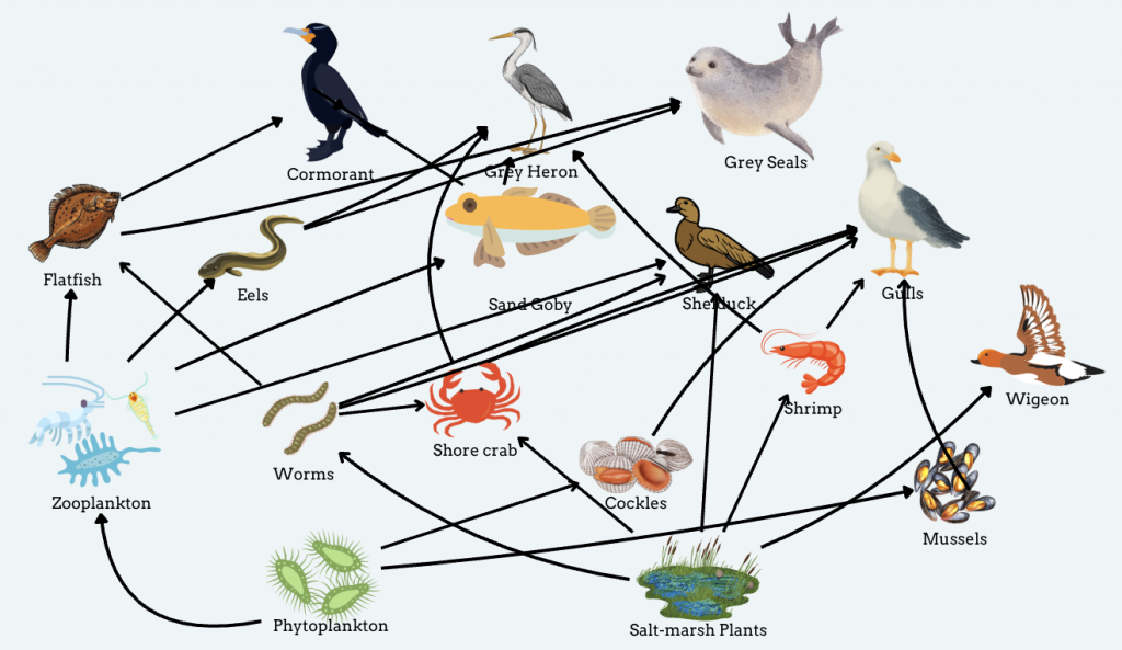 A food chain shows a direct line of who eats whom, often beginning with a producer like a plant and ending with a top predator. However, in natural habitats like the Mersey estuary, life isn’t so simple. Most organisms eat and are eaten by more than one other species, forming a food web—a more accurate picture of nature’s interconnectedness.